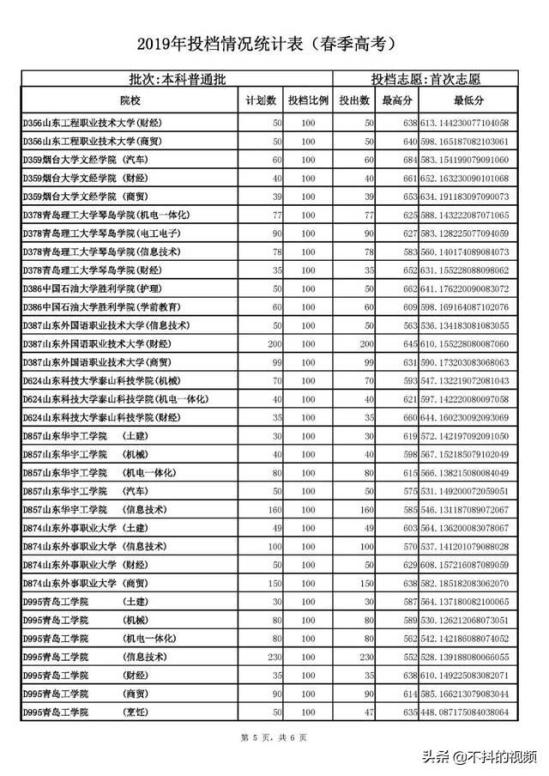 下面是2020年山东春考志愿填报参考资料,2019年山东春季高考投档分数表。大家可以参照这个分数看看能够上哪些学校。