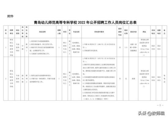 根据《事业单位人事管理条例》(国务院令第652号)、《事业单位公开招聘人员暂行规定》(人事部令第6号)等文件要求以及省、市有关规定,结合工作需要,青岛幼儿师范高等专科学校拟面向社会公开招聘46人。具体岗位及条件详见《青岛幼儿师范高等专科学校2022年公开招聘工作人员岗位汇总表》(附件)。