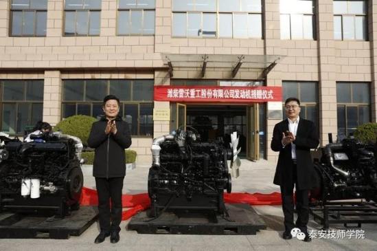 座谈会后,在匠艺楼前举办的捐赠仪式上,潍柴雷沃重工向学院捐赠了六台发动机。学院党委副书记、院长贾军和潍柴雷沃重工总经理助理戴绍普共同为捐赠的发动机揭幕。贾军在致辞中表示,学院将继续发挥人才培养优势,与企业一道,不断完善合作机制,创新合作形式,丰富合作内涵,扩大合作成效,实现优势互补,共同培养具有工匠精神和创新精神的技术人才,为促进经济社会发展作出更大贡献。戴绍普在致辞中介绍了公司的基本情况,并希望双方以此次捐赠为新的起点,进行更加广泛和密切的校企合作,达到互利共赢。学院党委委员、副院长张凯代表学院在捐赠协议上签字。