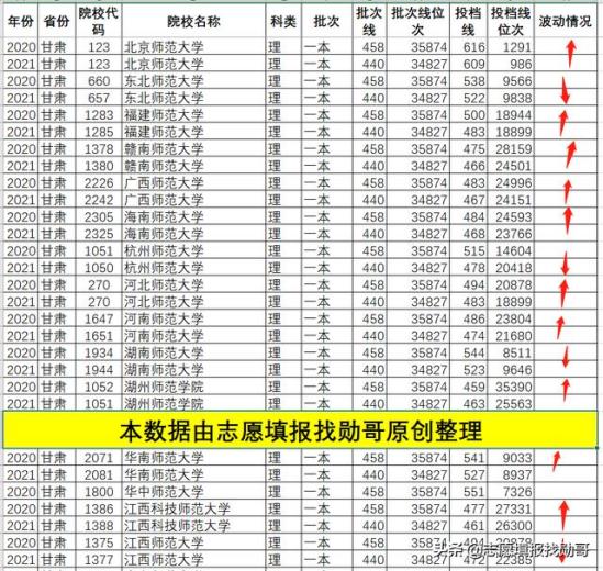 从甘肃省的录取数据来看,上升的学校,较安徽省要多。这说明在西部地区,考生报考师范类大学,相对较热!