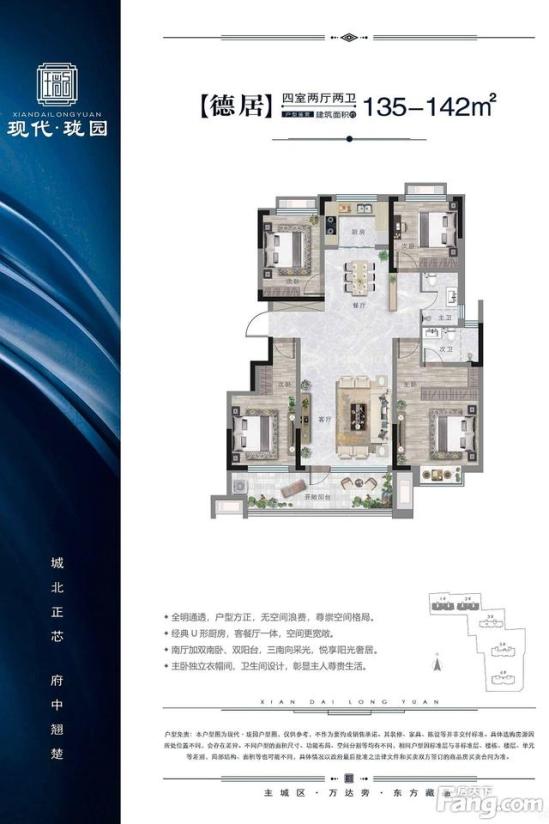建面约135-142㎡四室两厅两卫户型分布在1#、2#楼,全明通透,户型方正,无空间浪费,尊崇空间格局;经典U型厨房,客餐厅一体,空间更宽敞;南厅加双南卧、双阳台,三南向采光,悦享阳光奢居;主卧独立衣帽间、卫生间设计,彰显主人尊贵生活。
