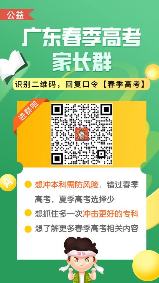 长按识别二维码下方二维码,进入广东高考家长话题群,春季高考一手资讯抢先看。