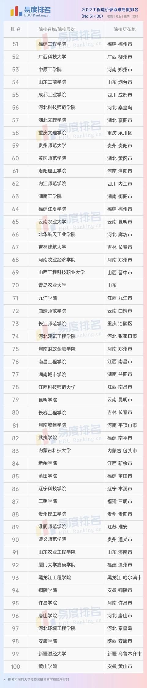 本期易度排名将公布“2022工程造价专业录取难易度排名”前100排名。(具体排名方式见文末)