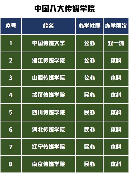我国目前传媒学院共有八所,其中民办传媒学院5所,公办传媒学院仅三所,排名第一的是大家公认的中国传媒大学,排名第二是浙江传媒学院。