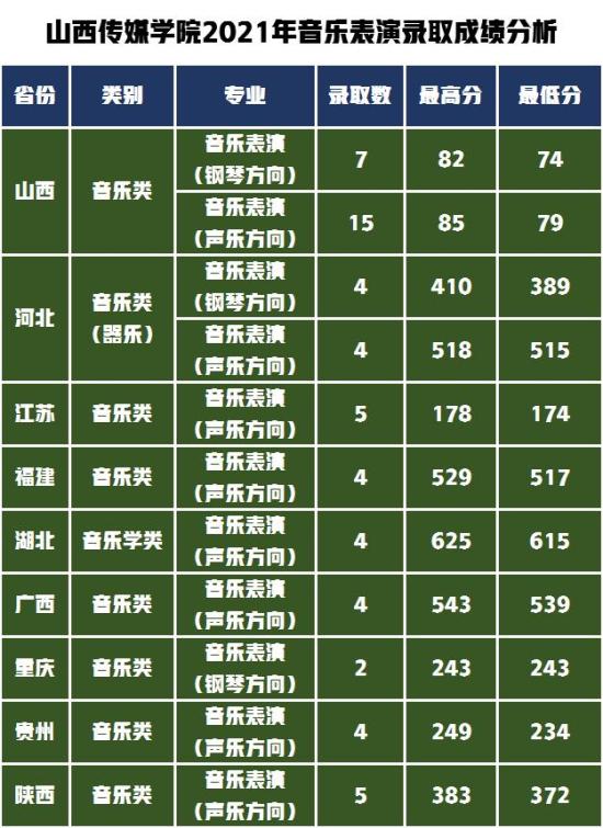 山西传媒学院2021年音乐表演专业共录取58人,各省录取成绩见下表。