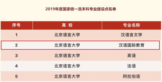 汉语国际教育专业北京语言大学汉语国际教育专业是全国高校中最早和连续大规模招收本科生的专业,该专业先后被确立为教育部和北京市特色专业,还获批2019年度国家级一流本科专业建设点。