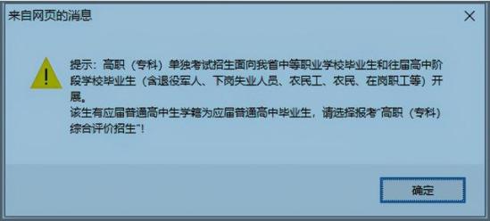 若考生为我省应届普通高中毕业生,请点击右侧高职(专科)综合评价招生。如选择错误,系统会自动识别并提示如下图:
