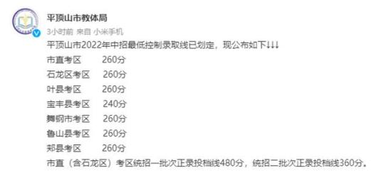 平顶山市2022年中招最低控制录取线已划定,现公布如下↓↓↓市直考区 260分石龙区考区 260分叶县考区 260分宝丰县考区 240分舞钢市考区 260分鲁山县考区 260分郏县考区 260分市直(含石龙区)考区统招一批次正录投档线480分,统招二批次正录投档线360分。