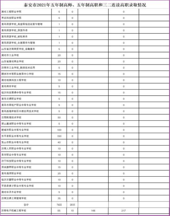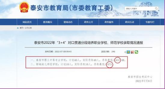 7月8日,泰安中考“3 4”对口贯通分段培养“本科”录取结果公布,聊城幼儿师范学校,录取10人,最低分为473分;泰安市理工中等专业学校,录取40人,最低分是437/4B。