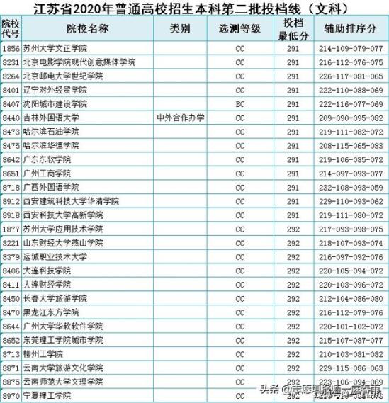 江苏省2020年高考中,本二文科最低投档分数为291-292分的学校,见下图。