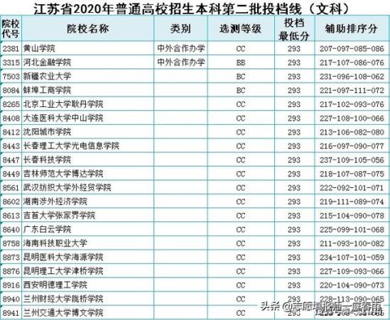 江苏省2020年高考中,本二文科最低投档分数为293分的学校,见下图。