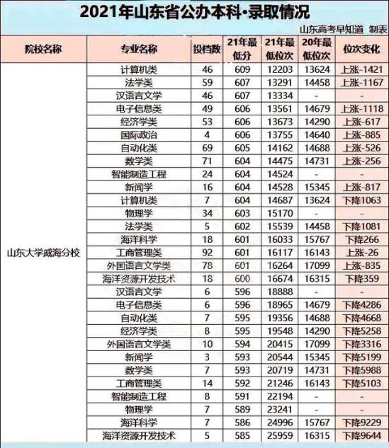 2)山东大学威海分校2021年的最低分是585分、25959名,就是海洋资源开发技术啦!