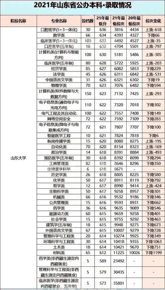 3)抛开定向西藏就业的专业,山东大学2021年的最低分是612分,位次比2020年降低了1199名。高分考生的1199名,大概就是2分左右,还是算平稳的。