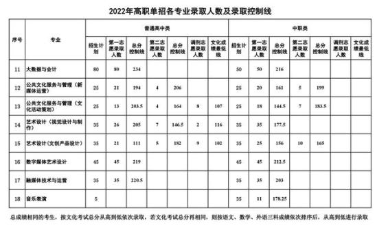 2022年单招录取文化控制线及各专业录取总分最低线如下:
