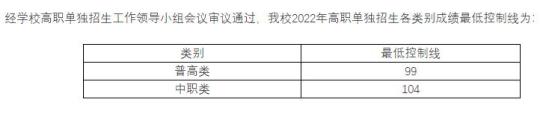 2022年单独招生各类别成绩最低控制线为: