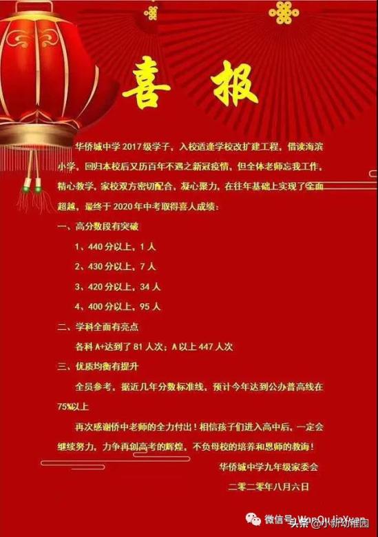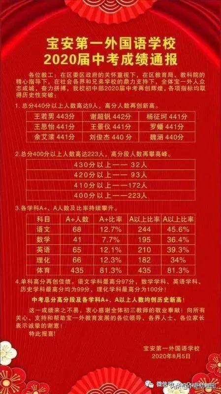 观澜二中2020年中考成绩简报:最高分441分。其中:440分以上1人;435分以上10人。【430分以上共30人,去年25人,较去年提升20%;400分以上260人,去年214人,较去年提升21.5%】