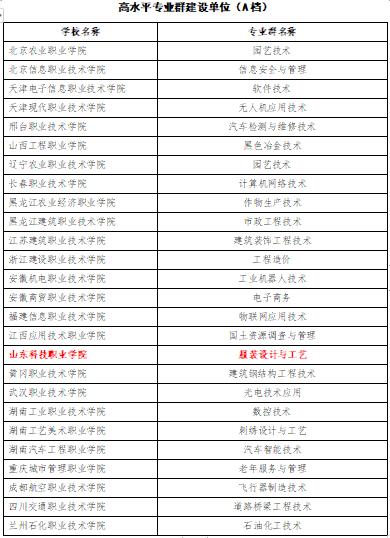 02.高水平专业群建设单位(A档),共有26所高职院校。山东入围的高职院校是山东科技职业学院,专业群名称:服装设计工艺。