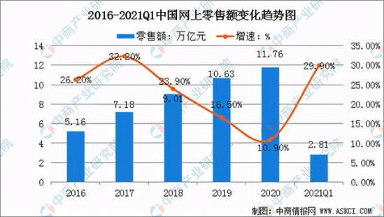 数据显示,2020年中国电子商务市场规模持续引领全球,服务能力和应用水平进一步提高。2020年。全国电子商务交易额达37.2万亿元,其中网上零售额11.76万亿元,同比增长10.9%。2021年,网络零售市场发展持续向好,一季度网上零售额为2.81万亿元,同比增长29.9%。