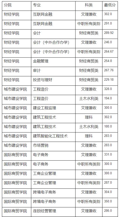 学院高职单招普高类招生2019年录取最低分数线224分(现代物业管理专业);2020年录取最低分数线237.17分(市场营销专业);2021年录取最低分数线224.67分(通信工程设计与监理专业)。