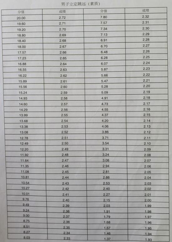 1.测试方法:任意距离助跑,单或双脚起跳,手指触摸痕迹最高点为测量高度,每人两次,取最高值。