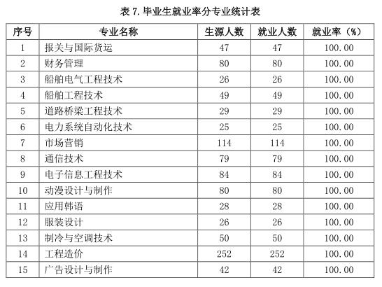 据介绍,烟台职业学院2018届毕业生共计6400人,全部为专科学历,截至报告期,实现就业6306人 ,总体就业率为98.53%,其中男生实现就业3007人,就业率为98.69%;女生实现就业3299人,就业率为 98.39%。2018届毕业生分布于52个专业,截至报告期,有50个专业就业率达90%以上,其中报关与国际货运、财务管理、船舶电气工程技术等40个专业就业率达100%。
