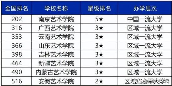 除了上面说的那些,一些艺术学院也可以供考生们选择,比如说南京艺术学院、广西艺术学院、山东艺术学院、云南艺术学院等,在2022年艾瑞深校友会艺术类大学排名中,这些院校纷纷榜上有名,南京艺术学院排名全国第202名,广西艺术学院排在全国第316名,云南艺术学院排在全国第353名,山东艺术学院排名全国第366名。这类院校通常下设多个艺术类专业学院,音乐、美术、舞蹈等等,每年也都是艺术生的热门选择。