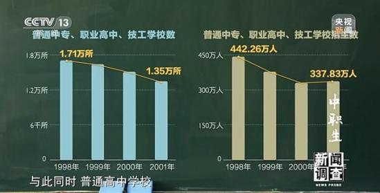 到了2001年,全国普通中专、职业高中、技工学校共有1.35万所,比1998年的1.71万所减少了3600多所,招生规模从每年442.26万人减少至每年337.83万人。与此同时,普通高中学校从1.39万所增加到了1.49万所,招生规模从每年359.55万人增加到了每年557.98万人。