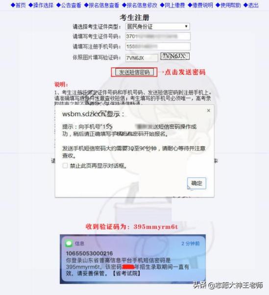 然后开始注册考生信息,尽量选择用身份证注册,然后选择一个正常使用的手机号码,尽量不要选择用孩子自己的,用家长平时使用的手机号即可。注意一下常见问题,这个如果有考生遇到不要慌。