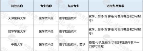 2020年海南等地采用3 3选科模式,在该模式下,大部分院校的医学技术类专业要求从化学或生物中选考一门,如天津医科大学、陆军军医大学等。个别院校要求从物理、化学或生物中选考一门,如中南大学等。
