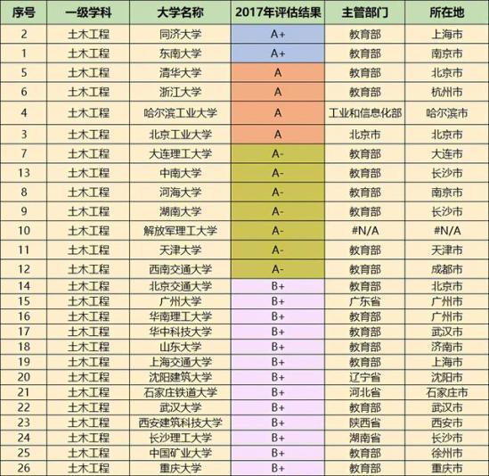 小编的文章主要就是写给那些小白家长的。比如今天介绍的土木工程专业排名前26的大学,它们2017年的学科评估结果均在这张表上。剩下的26名之外的大学,我没有进行罗列,如果有需要,您可以找我。