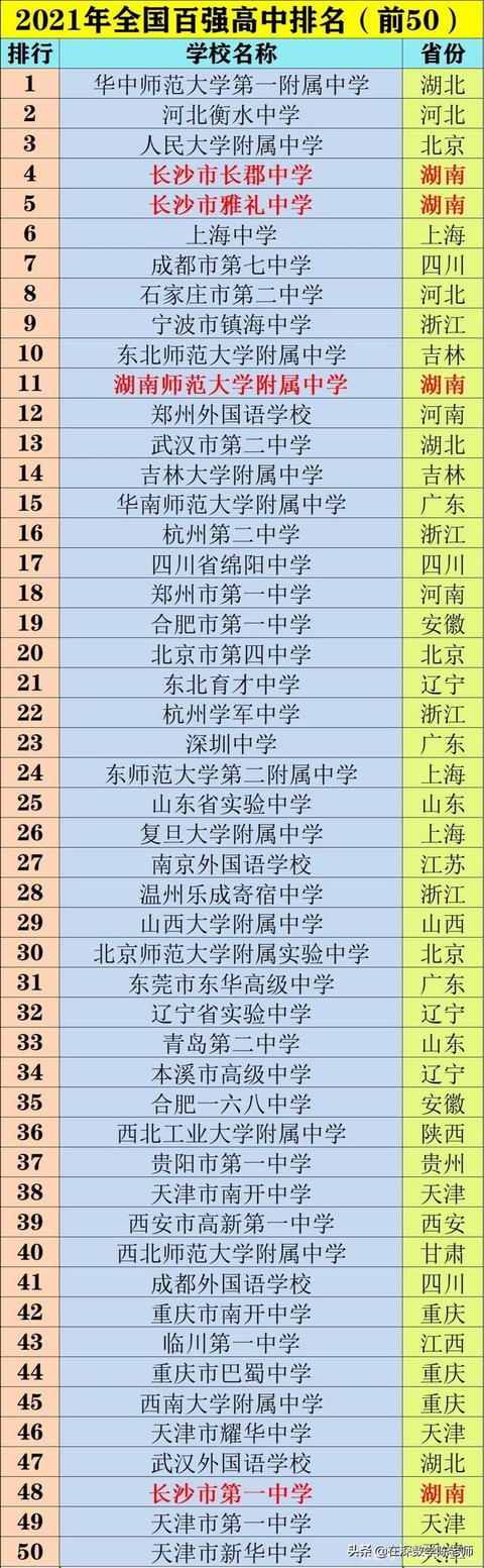 本表格排名大体传达了我国目前高中的前50名。即使有偏差,主要也是学校之间排名次序的差别和第50名上下几所学校之间的偏差。