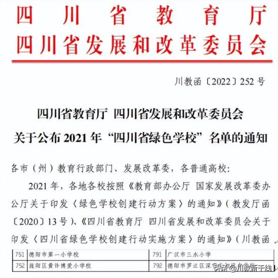近日,四川省教育厅、四川省发展和改革委员会联合公布了2021年“四川省绿色学校”名单,德阳市罗江区深雪堂初中成功获评“四川省绿色学校”。