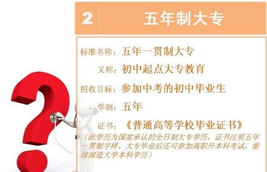 五年一贯制五年一贯制的毕业能拿到普通全日制大专证,但学校是指定了的,五年都需要在一所高校学校,中途也不能随意换专业。前三年执行中职学校收费标准,后两年执行高职院校收费标准。学历含金量一般,多数企业不认可。