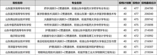 最高分为山东医药高等专科学校的药学专业,分数为477分,高出一段线33分。