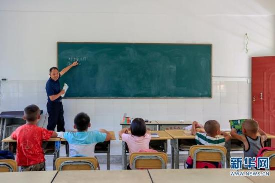 农加贵在给一年级、学前班的学生们上数学课(摄于7月6日)。(新华网 赵普凡 摄)