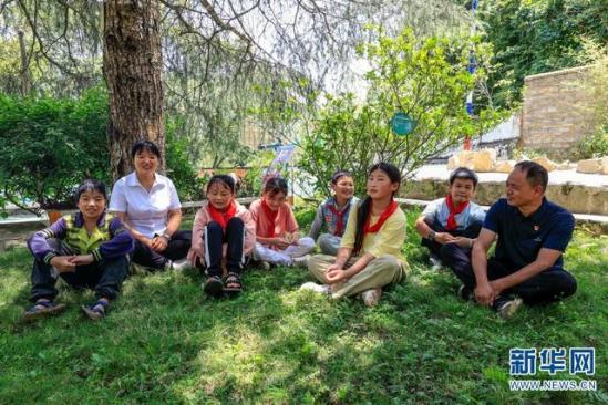 落松地小学的6名毕业生和农加贵老师(右一)、朱丽丹老师(左一)在校门口留影(摄于7月6日)。(新华网 赵普凡 摄)