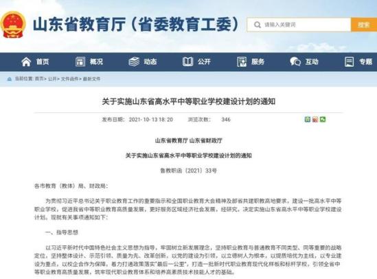 为打造一批新时代职业教育现代化样板和标杆学校,引领全省中等职业教育高质量发展,夯实职业教育基础,近日,省教育厅、省财政厅联合印发《关于实施山东省高水平中等职业学校建设计划的通知》(鲁教职函〔2021〕33号),启动实施高水平中等职业学校建设计划,集中力量建设100所左右高水平中等职业学校。
