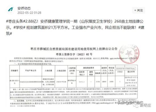 同年2月24日,山东煤炭卫生学校以安侨健康管理学院项目出现在枣政字〔2022〕8号 枣庄市人民政府关于下达2022年市重点项目名单里,总投资50亿,2022年计划投资3亿。