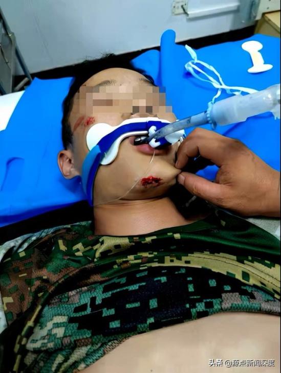 在周晓家人提供的视频和照片中,记者看到,他穿着军训时的服装躺在抢救床上,嘴里和身上插着抢救时的管子,右脸和下巴处有血迹。