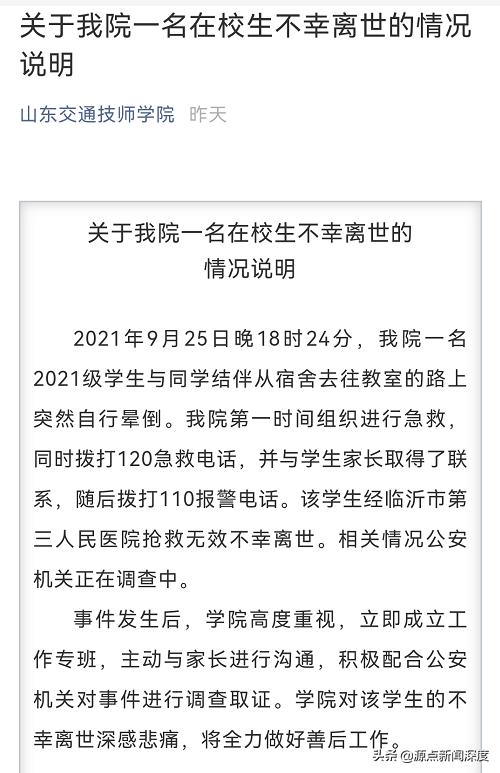 9月27日,该校通过官方微信公众号发布“关于我院一名在校生不幸离世的情况说明”称,2021年9月25日晚18时24分,我院一名2021级学生与同学结伴从宿舍去往教室的路上突然自行晕倒。我院第一时间组织进行急救,同时拨打120急救电话,并与学生家长取得了联系,随后拨打110报警电话。该学生经临沂市第三人民医院抢救无效不幸离世。相关情况公安机关正在调查中。