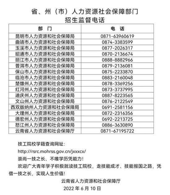 云南网讯(记者 杨萍)为鼓励更多青年学生接受技工教育,规范我省技工院校招生办学行为,经云南省人力资源和社会保障厅审核,截至目前,全省共有34所技工院校具备招生资质。凡不在目录内的学校及专业,均未经审批,不得开展招生。现将2022年全省具备招生资质的技工院校目录及省、州(市)人社部门招生监督举报电话予以公布,欢迎监督。