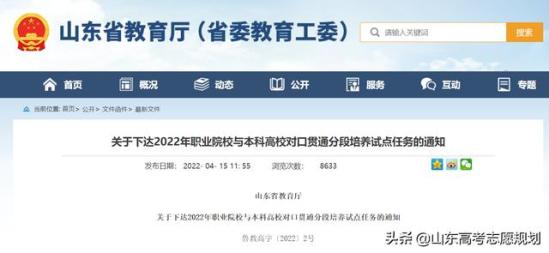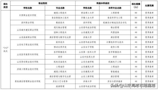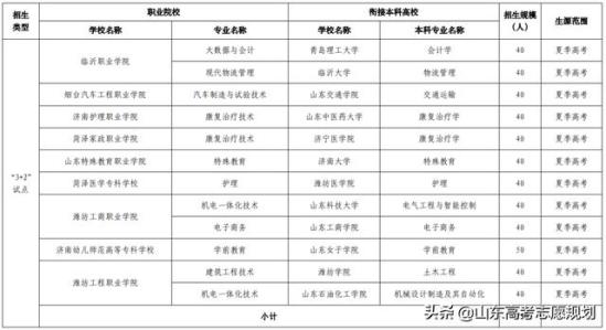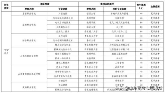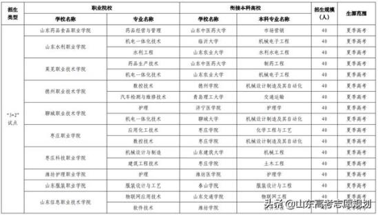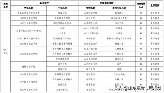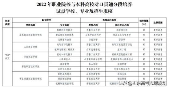 根据鲁教高字〔2022〕2号文《关于下达2022年职业院校与本科高校对口贯通分段培养试点任务的通知》,山东“3 2”对口贯通分段培养2022年试点高职院校50所,共计91个专业点,衔接本科高校28所,招生规模4730人。