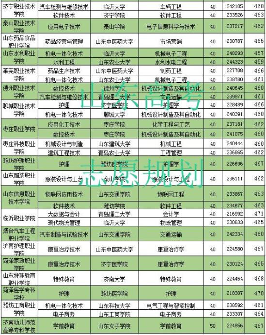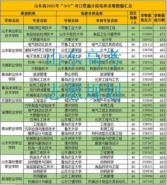 下图为山东2021年‘’3 2”类型的录取数据,2021年该类型招生的录取最低分为456分(位次249870),高于一段线2021年一段线12分,为山东科技职业学院对接潍坊学院的自动化专业;录取最高分为476分(位次204780),高于一段线32分,为山东医学高等专科学校对接山东中医药大学的药学专业。