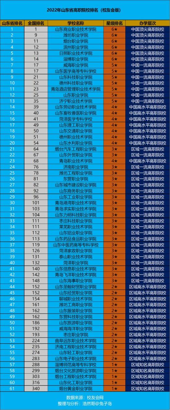 根据中国校友会网(艾瑞深中国校友会网 )最新发布的2022中国大学排行榜,2022年度的大学排名中山东省共有61所高职院校进入排名!