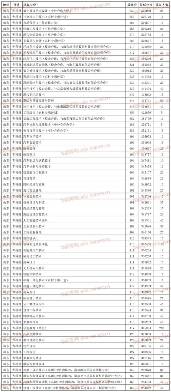 山东科技职业学院录取分数线在400分以下的专业中,仅有3个普通专业方向,录取分数线在400分以上的,除了一个机电一体化技术(农村专项计划),其他专业均为普通专业方向,4个高职3 2贯通培养专业分数线均在本科控制线以上。