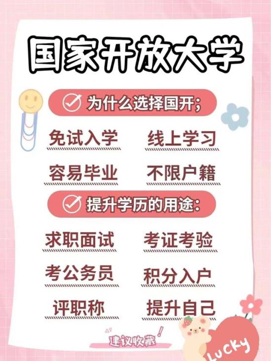 国家开放大学,免试入学,只要考生携带相关的报考资料即可报名成功,且考生只要在规定的学制内完成学业,即可顺利毕业,获得国家开放大学学历;