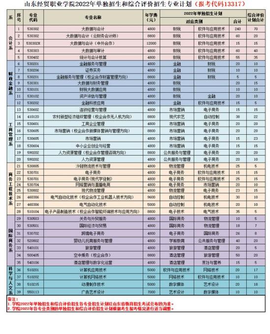 山东经贸职业学院2022年单独招生和综合评价招生招生简章正式发布了,报名时间为2021年12月27日—31日。 根据计划,山东经贸职业学院2022年单独招生计划1125人,综合评价招生计划600人,总计划1725人。根据相关规定,单独招生面向山东省中等职业教育应届毕业生(含普通中专、职业高中、职业中专、成人中专、技工学校)和社会人员(取得高中阶段教育毕业证书或具有同等学力)开展。综合评价招生面向我省普通高中应届毕业生开展。