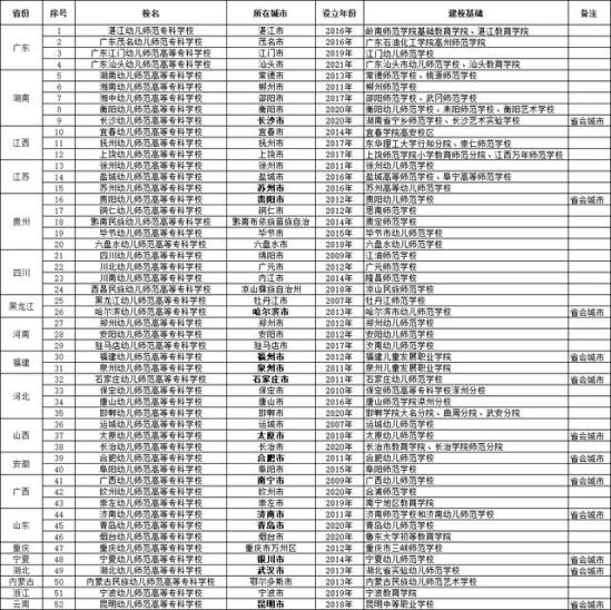 当前,31个省市自治区直辖市中,共有20个省份设置了幼儿师范高等专科学校,总数量为52所。我们看看名单: