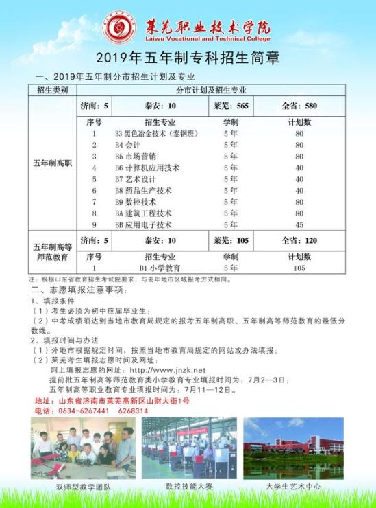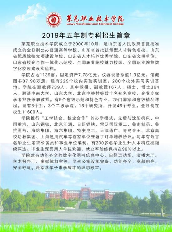 学生毕业时颁发教育部注册备案、统一验印的公办全日制普通高等职业学校专科毕业证书,山东省人力资源和社会保障厅同时签发高等学校毕业生就业报到证。地址:山东省济南市莱芜高新区山财大街1号网址:http://www.lwvc.edu.cn电话:0634-6268314,6267441,6267072QQ:1554209355初中后五年制招生简章学校还招收初中后五年制高等职业教育和五年制高等师范教育共10个专业,详见简章: