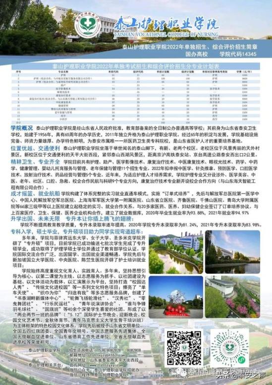 泰山护理职业学院是经山东省人民政府批准,教育部备案的全日制公办普通高等学校;其前身为山东省泰安卫生学校,始建于1956年,具有65周年的办学历史,2011年独立升格为泰山护理职业学院。经过65年的积淀与发展,学院基础设施完备、师资力量雄厚、办学特色鲜明,为泰安市属唯一一所医药卫生类专科院校,是山东省医护人才的重要培养基地。
